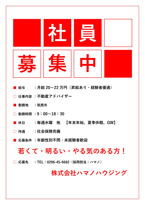株式会社ハマノハウジング > 株式会社ハマノハウジング おうち探しのハマノハウジングのスタッフブログ記事一覧 > ★社員募集しています★